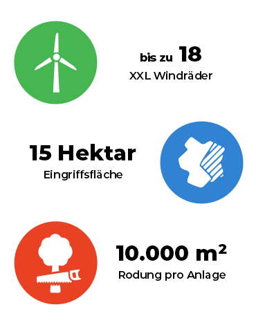 Je Anlage ist mit einer Rodung von mindestens einem Hektar Waldfläche zu rechnen. Bei 18 Anlagen ergibt sich eine Gesamtfläche von über 15 Hektar Eingriffsfläche – ein Großteil davon in ökologisch sensiblen Höhenlagen und Waldstücken mit hohem Artenvorkommen.